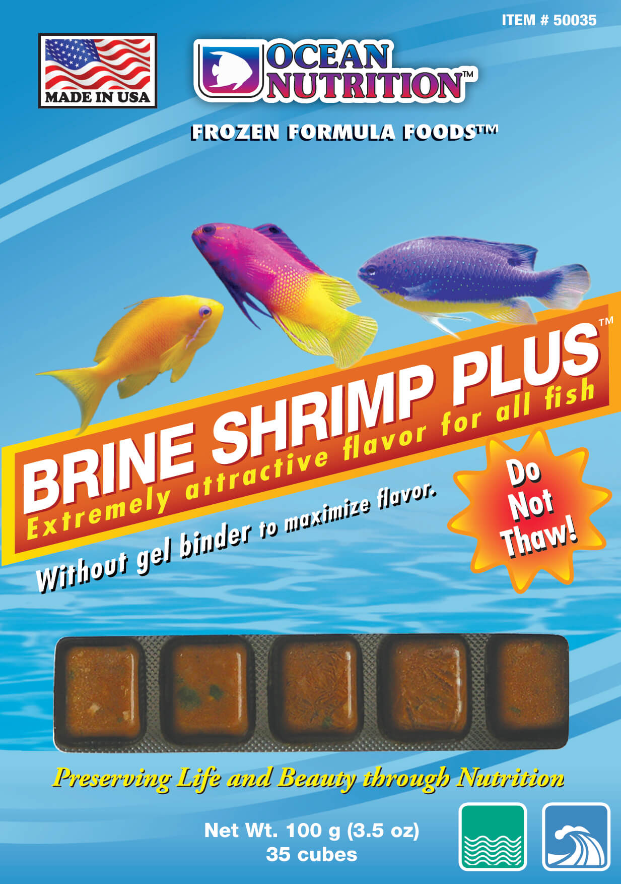 Frozen Brine Shrimp Plus™ is a gourmet frozen food for all carnivorous and omnivorous tropical fishes and invertebrates. It is a special blend of brine shrimp supplemented with a nutritious blend of seafood, plankton, algae and vitamins that mimic the nutritional value of a natural diet with an appealing flavor to entice finicky eaters. This formulation can be fed to a multitude of fish and invertebrates that enjoy the familiar flavor of brine shrimp and require a balanced diet. Brine Shrimp Plus does not contain a gel binder and is an excellent product to simultaneously feed the fish corals and invertebrates in reef aquariums. The bite-sized pieces feed the fish; the juices and fine particles feed the reef. This blend of premium ingredients is easy for fish and invertebrates to digest so they produce less waste and aquariums stay cleaner.