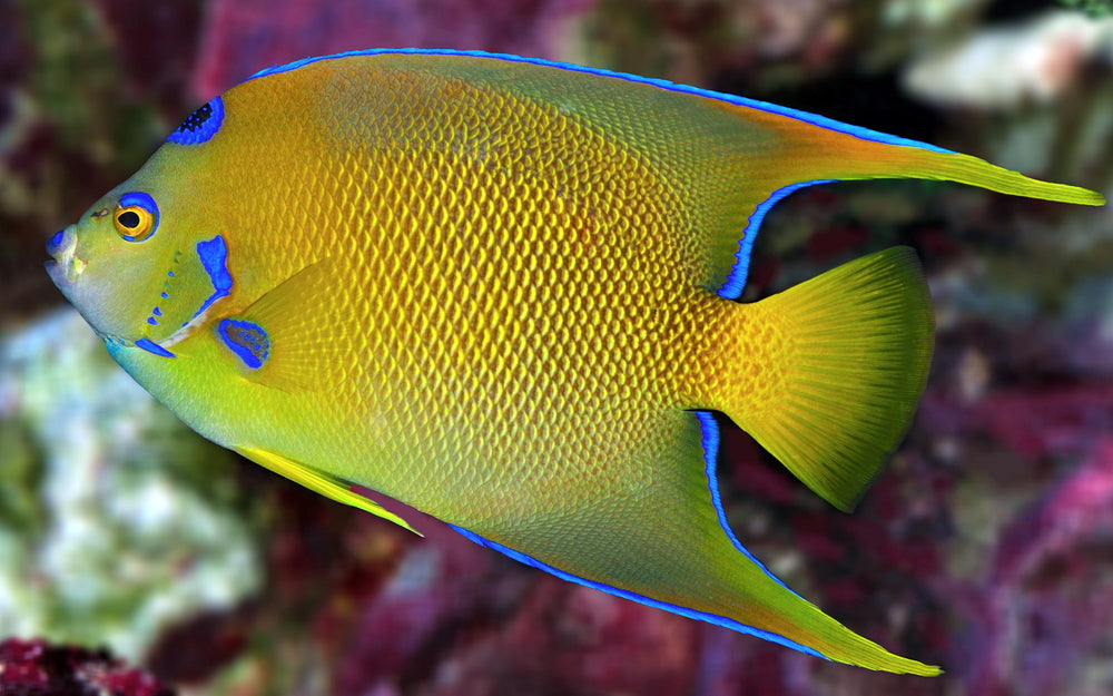 The Queen Angelfish comes in different sizes: the Small Juvenile will have juvenile colorations or may be transitioning to a young adult, while the Medium will be a sub-adult, and the Large will have adult coloration.