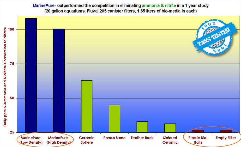 * MarinePure's thick blocks are designed to be used in passive systems to control Nitrates (like live rock). If used in active systems they will eliminate ammonia and nitrites (nitrification).