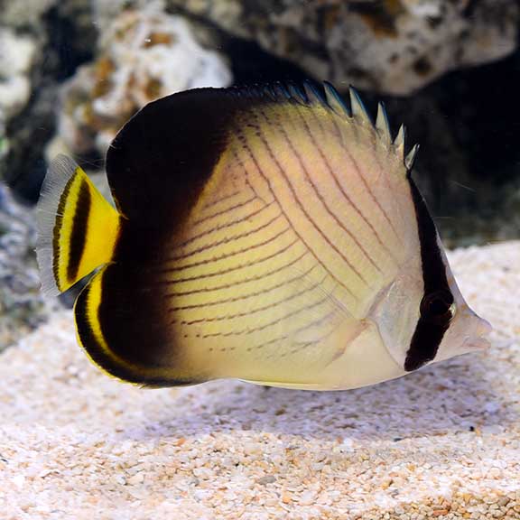 The Vagabond Butterflyfish boasts a primarily white body adorned with striking diagonal stripes, forming chevron-like markings. Its captivating appearance is accentuated by a black eye band, while the dorsal, caudal, and anal fins showcase a vibrant yellow color with two black vertical bands.