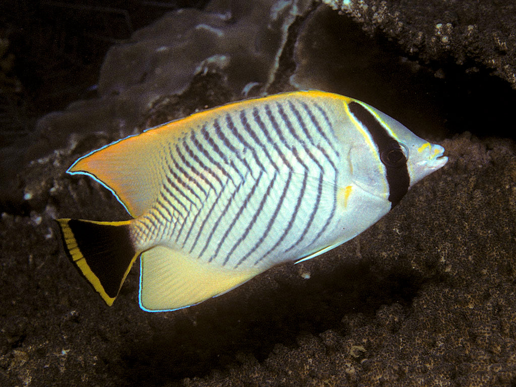 Appearance: The Chevron Butterflyfish has a distinct and eye-catching appearance with its black chevron-shaped pattern on a white body. It features a yellow tail fin and a yellow band across the head.
