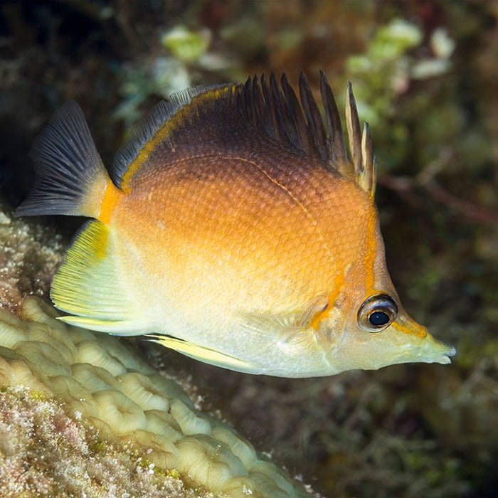 The Longnose Atlantic Butterfly, also known as Poey's Butterflyfish, Caribbean Longsnout Butterflyfish, and the Rosy Butterflyfish, is a hardy deep reef inhabitant ideal for showcase aquariums. In addition to its distinctive pointed snout, the Longnose Atlantic Butterflyfish is amber in the center of the body, darkening to brown along the back and fins, and creamy-yellow along the stomach area.