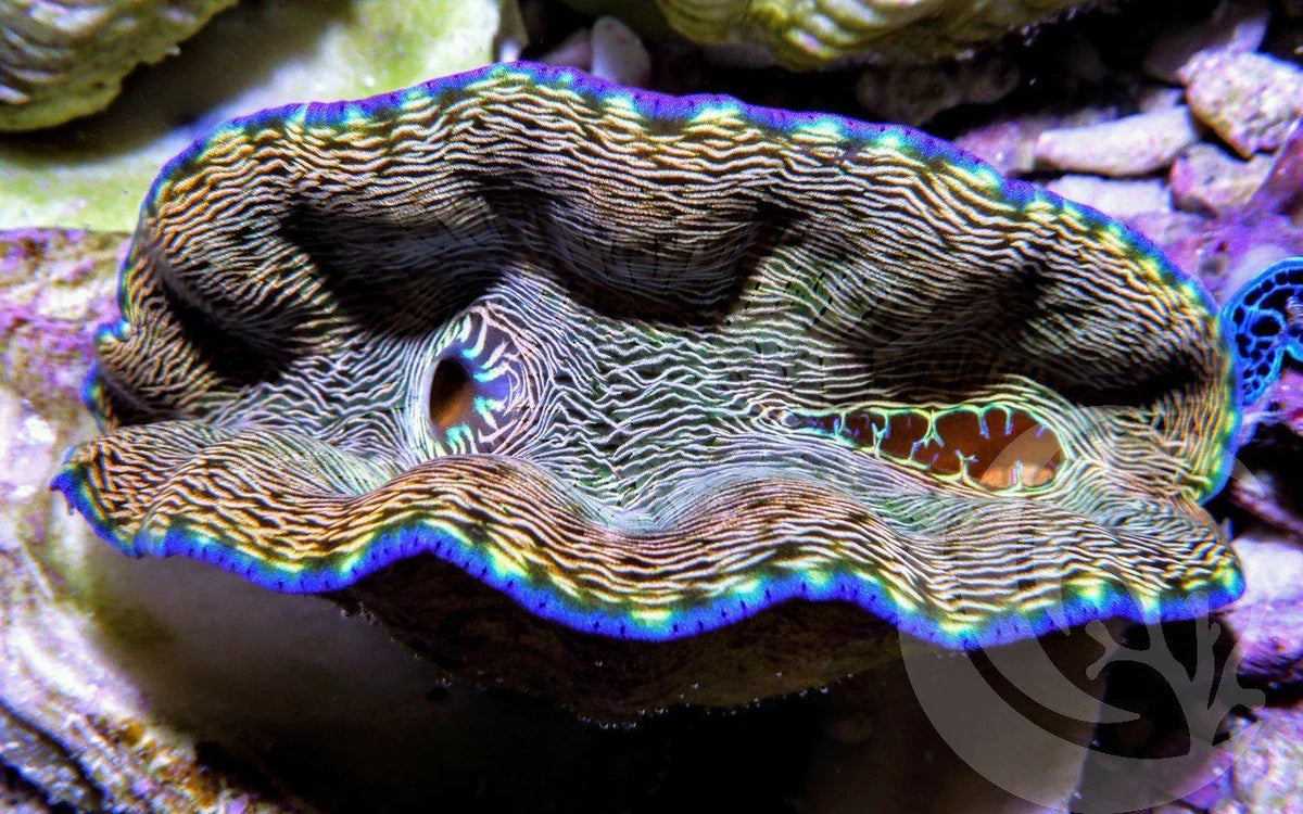 In the wild, Tridacna derasa can be found in the Indo-Pacific, Central Pacific, South Pacific, and Coral Sea, occupying outer reef habitats on both sandy and hard-packed substrates, either solitary or in small aggregations, at depths ranging from 10 to 60 feet. Derasa Clams available in the aquarium trade are all cultured in the Central and South Pacific Oceans. While they come in various colors and patterns in the wild, the ones intended for the aquarium trade are typically gold, brown, orange, or yellow, with vibrant blue or green trim edging that surrounds the mantle.