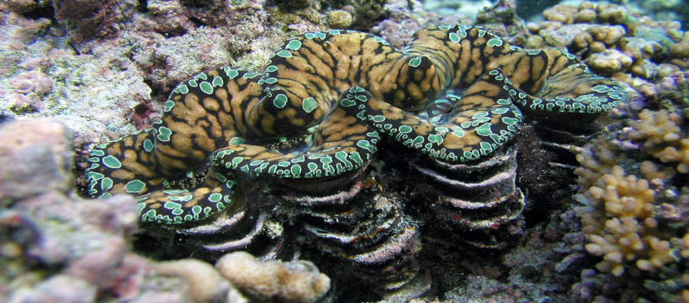These clams have a broad range in the wild and are found in Central and South Pacific, the Coral Sea, the Indo-Pacific, the Indian Ocean, and the Red Sea. They are commonly found living among live and dead stony corals of the genus Acropora at depths up to 50 feet. Tridacna squamosal in the aquarium trade are cultured in the Central Pacific and South Pacific Ocean and are primarily gold, brown, and yellow with occasional orange, green, or blue spots. The rarest color form of Tridacna squamosal is all blue, and it is rarely available in the aquarium trade, with a very high price.