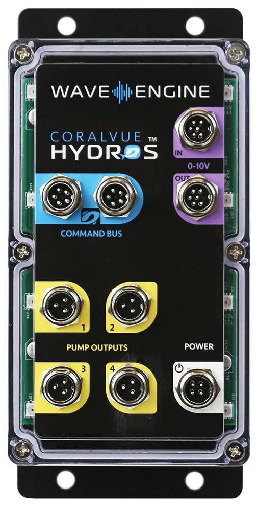 The HYDROS WaveEngine is compatible with 3rd party controllers such as the Neptune Systems APEX, the Reef Angel, GHL Profilux and others via the 0-10V control port.