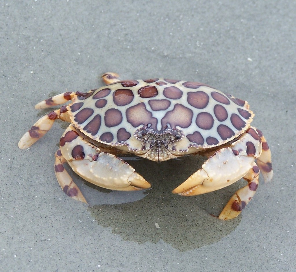 The Calico Crab is a type of walking crab that has back legs that are suited for walking, rather than swimming or digging. They are typically scavengers, feeding on various organic matter. One unique feature of the Calico Crab is that it may carry a Tri-colored Anemone on its back, which can detach during molting.
