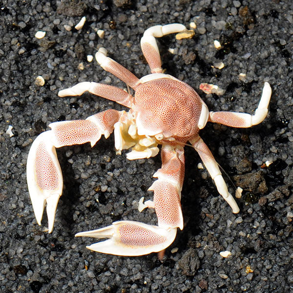 The Porcelain Crab is a widespread species found in tropical oceans worldwide. It has a circular, flattened body with two large front claws. The crab possesses maxillipeds, a pair of front arms with feather-like tips, which it uses to filter food particles from the water. This species is peaceful and makes for an interesting addition to a marine aquarium.