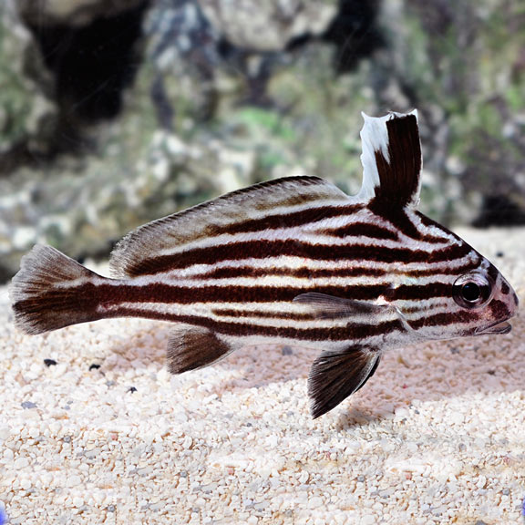 The High-Hat, also referred to as the Hi-Hat, boasts a glistening silvery body adorned with dark horizontal stripes and a tall front dorsal fin. To ensure its well-being, this species necessitates a tranquil community setting within a spacious 70-gallon aquarium or larger. The aquarium should feature a sandy bottom and an abundance of hiding spots. During the initial acclimation to its new environment, the High-Hat typically remains concealed until it feels secure.