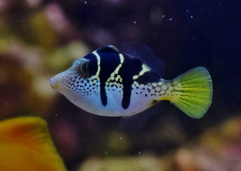 The Mimic Saddle Puffer is a fascinating filefish species that has evolved its body shape and coloration to imitate the appearance of the Valentini Puffer. By mimicking these puffers, they deceive potential predators into believing they are unpalatable, providing a clever defense mechanism. These fish boast an intriguing look, featuring dark brown bands across the midsection, brownish-orange spotting on the lower half, vibrant yellow fins, and blue striping along the back. They are unique in that they lack pelvic fins but have adapted to using their pectoral fins for movement within the aquarium. One way to distinguish them from the puffers they mimic is by examining their dorsal spine – the filefish has two dorsal spines, while the puffer has only one.