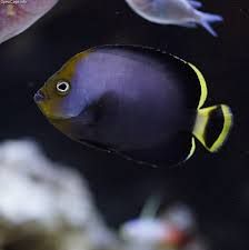 The Black Velvet Angelfish, also referred to as the Gray Poma, showcases a predominantly black body with a distinctive gray patch on its head and the upper half of its body. A striking yellow outline adorns its tail and the posterior tip of the dorsal fin.