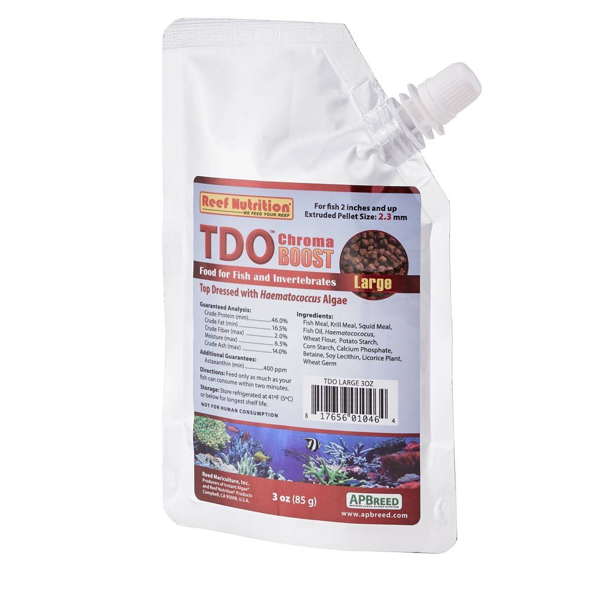 Reef Nutrition by Reed Mariculture TDO Chroma BOOST food is granulated and pelletized then "top dressed" with Haematococcus Algae providing an excellent source of astaxanthin leading to healthy animals that are able to show off their vibrant colors. Used by many marine breeders, TDO Chroma BOOST comes in many different sizes and can give you the best chance to raise fish larvae into full grown adults.