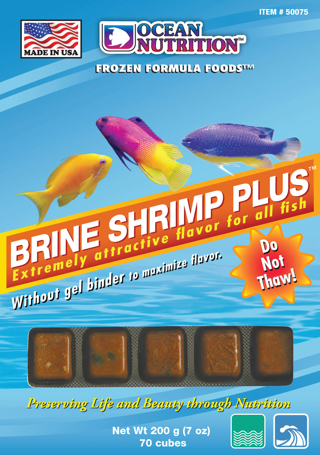 Frozen Brine Shrimp Plus™ is a gourmet frozen food for all carnivorous and omnivorous tropical fishes and invertebrates. It is a special blend of brine shrimp supplemented with a nutritious blend of seafood, plankton, algae and vitamins that mimic the nutritional value of a natural diet with an appealing flavor to entice finicky eaters. This formulation can be fed to a multitude of fish and invertebrates that enjoy the familiar flavor of brine shrimp and require a balanced diet. Brine Shrimp Plus does not contain a gel binder and is an excellent product to simultaneously feed the fish corals and invertebrates in reef aquariums. The bite-sized pieces feed the fish; the juices and fine particles feed the reef. This blend of premium ingredients is easy for fish and invertebrates to digest so they produce less waste and aquariums stay cleaner.