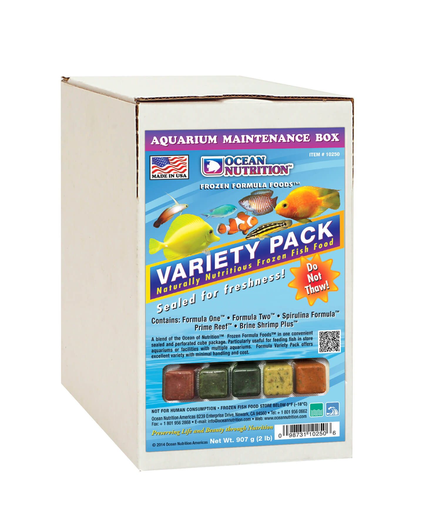 An assortment of theOcean Nutrition™ Frozen Formula Foods™ in one convenient resealable package. Includes Formula One, Formula Two, Prime Reef, Angel Formula, Brine Shrimp Plus, Spirulina Formula, and Special Formula VHP (Very High Protein). Particularly useful for feeding fish in store aquariums or facilities with multiple aquariums. Formula Variety Pack offers excellent variety with minimal handling and cost.