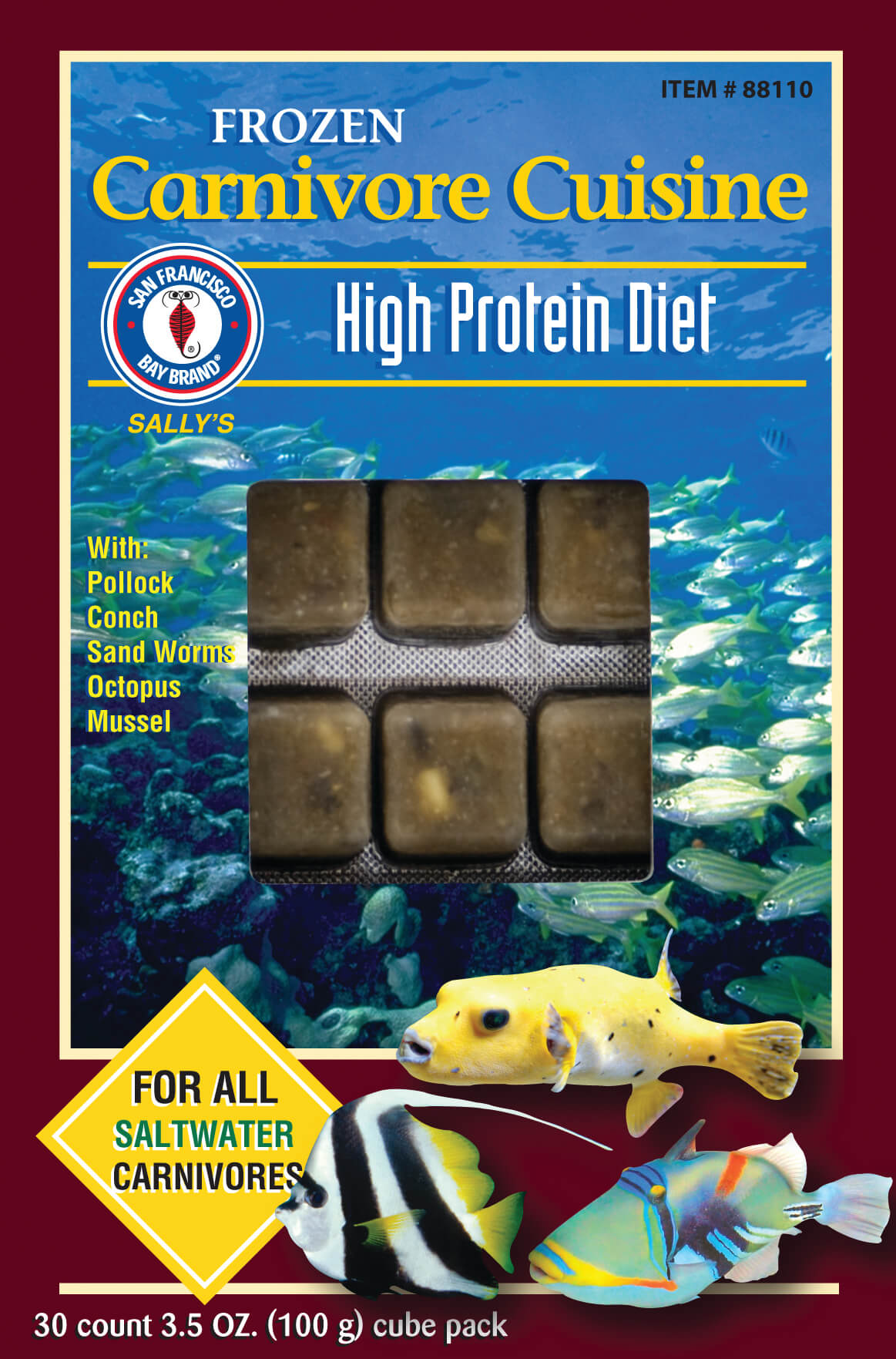 Carnivore Cuisine™ is a blend of natural seafood ingredients, marine worms, natural color enhancers and vitamins resulting in a nutritious diet for your marine carnivores. It has a familiar scent that stimulates your fish to feed aggressively. This formula provides essential nutrients that help maintain high energy levels and vigor in your fish.