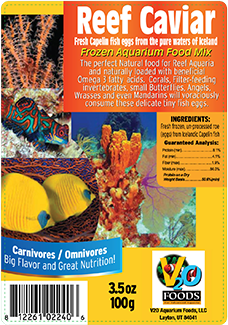 Fresh Capelin fish eggs from the pure waters of Iceland. The perfect Natural food for Reef Aquaria and naturally loaded with beneficial Omega 3 fatty acids. Corals, Filter-feeding invertebrates, small Butterflies, Angels, Mrasses and even Mandarins will voraciously consume these delicate tiny fish eggs.
