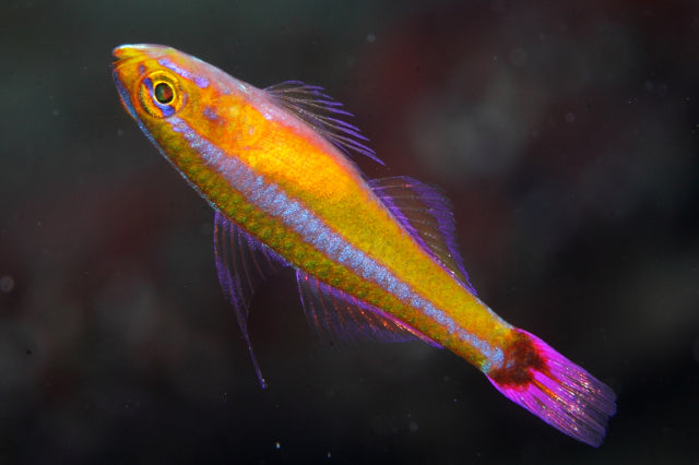 The Blue-Stripe Cave Goby, scientifically known as Trimma tevegae, is a tiny but fascinating fish that goes by various common names, such as Bluestripe Pygmygoby and Tevegae Pygmygoby. These petite creatures can be found in the waters of the western Pacific Ocean, where they seek refuge within caves and crevices, sustenance coming from small crustaceans and zooplankton. With a maximum size of merely 2 inches, they tend to spend the majority of their lives sheltered in schools amidst rock formations. It is essential to avoid housing them with predatory or aggressive fish, as they prefer the company of their own kind in a small school. Their carnivorous diet should consist of mysis or small crustaceans. Keeping them in an aquarium with a minimum capacity of 10 gallons will provide a suitable environment for these intriguing Blue-Stripe Cave Gobies.