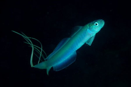 The Filamented Blue Gudgeon Dartfish, also known as the Threadfin Dart Goby, is native to the rubble zones of Cebu. Its elongated body features a pale blue or green coloration, and it stands out with its long flowing split tail. In their natural habitat, they often coexist with pistol shrimp in their burrows, although they don't interact directly. These dartfish prefer being in pairs and make a fantastic addition to both fish-only and reef aquariums.