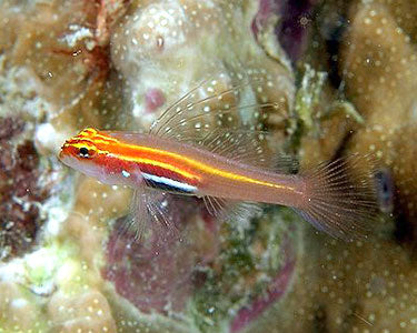 The Gold Neon Eviota Goby, originating from the reefs of Cebu, is a rare gem in the aquarium industry. These small gobies typically grow to a maximum length of 1 inch. Their elongated bodies display an opaque coloration with striking red vertical bands. Notably, their eyes feature eye-catching gold rims, while their noses are adorned with white markings. These active and peaceful gobies make a delightful addition to both saltwater reef and fish-only aquariums.