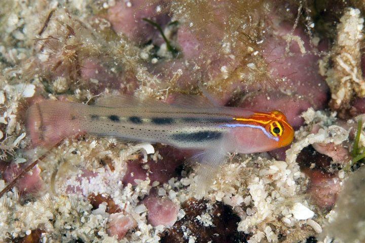 The Red Head Goby, also known as the Redhead Goby, previously classified as Gobiosoma puncticulatus, showcases a strikingly bright red head adorned with intricate yellow and white markings. Its body features dark spots along the sides, creating a captivating and cute appearance that makes it a delightful addition to any aquarium.