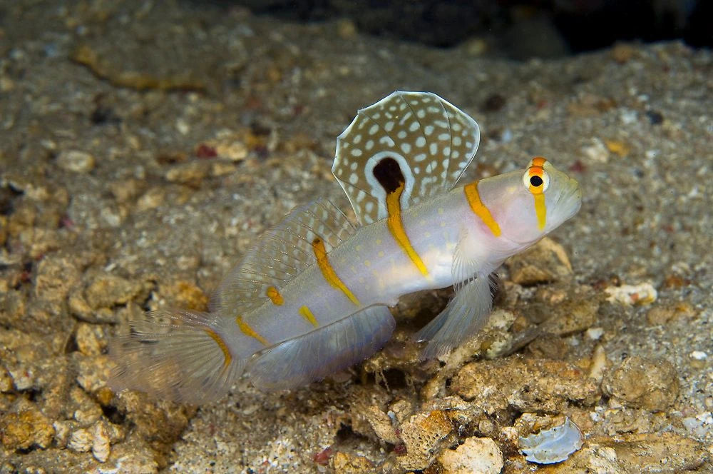 The Randall's Shrimp Goby, also known as the Orange Stripe Prawn Goby, was first documented in the Western Pacific in 1978 by Hoese and Steene. Its body is predominantly white with striking orange stripes, including one running over its eyes and encircling its entire head. A distinctive feature of the male is the fan-like dorsal fin, which displays a dramatic eyespot.