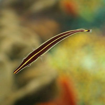 The Yellow Stripe Clingfish, also known as the Urchin Clingfish, hails from the reefs of Indonesia. It boasts a slender reddish-brown body adorned with two striking yellow stripes that run along its length. Notably, its round tail features a vibrant yellow spot at its center.