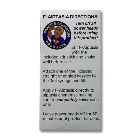 Turn off all power heads. Using the included syringe, apply F-Aiptasia directly on to aiptasia anemone and completely cover it! Leave power heads off for 30 minutes or until product hardens. After several hours, F-Aiptasia will create a 'shell' over the anemone and trap it with the caustic product inside the shell. This robs the anemone of the ability to release reproductive spores in the aquarium!