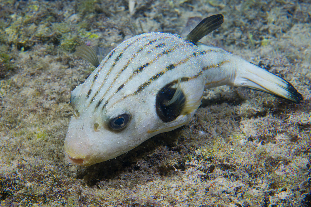 The Striped Dogface Puffer, scientifically known as Arothron manilensis, possesses captivating large eyes and a small, sad-looking mouth. Its distinctive circular slender lines add to its unique appearance. Often referred to as "aquatic dogs" due to their interactive behavior with humans, these Pufferfish can be quite endearing. However, it's important to note that they are not considered reef safe. Being voracious carnivores, they readily consume small invertebrates, while also grazing on algae without causing harm to corals.