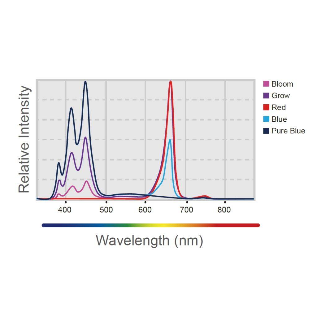 Four individual settings allow for either a Blue, Grow, Bloom, or Red spectrum to help increase your yield and offer the best coloration for your type of algae. You can change between the different spectrums through the built-in dial controls or connect it to any 0-10V controller, like an Apex, or the Kessil H-Series Controller to create daily programs with ever-changing spectrums and intensities. Each spectrum is perfectly blended to offer a full-spectrum that ranges from 380nm all the way up to 780nm.