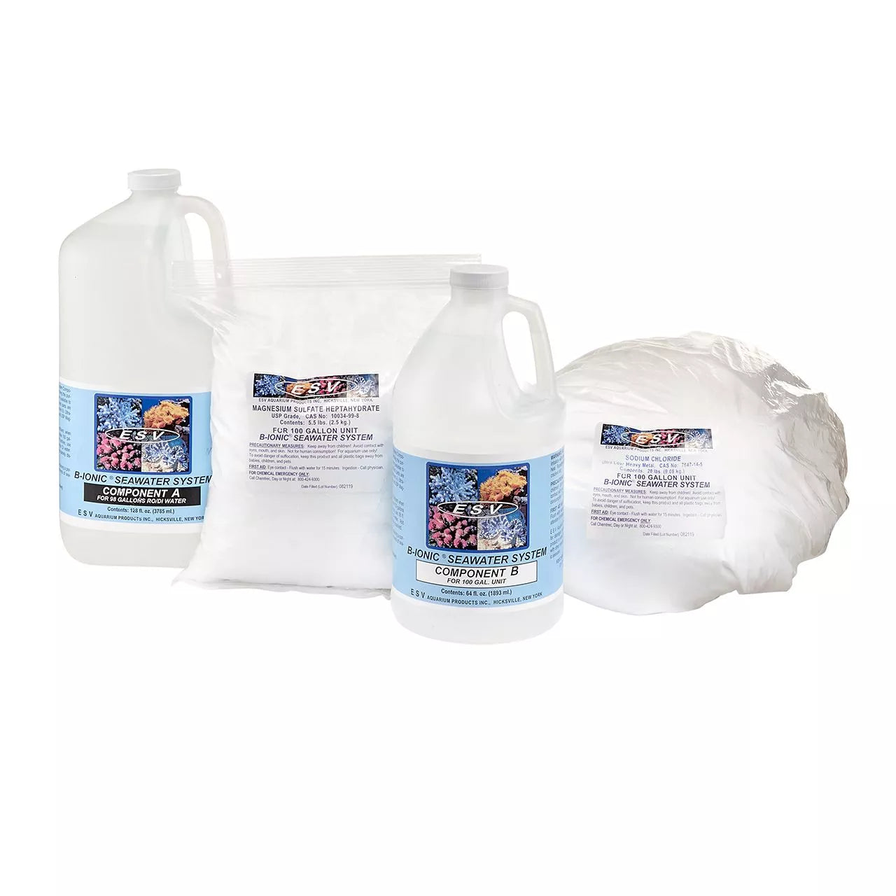 The ESV B-Ionic Seawater System includes all of the consumables used to create the fast-dissolving saltwater, without the measuring devices. The B-Ionic Seawater system comes in 4-parts that you can mix together to create a super high-end salt mix. Keeping the separate parts isolated until mixing time allows for more consistent batches of saltwater since you no longer need to worry about the stratification of the individual particles in the salt mix since the dry portion of the mix is all the same element. Even with manual mixing, that gives you the utmost control, the ESV B-Ionic Seawater system is by-far the fastest mixing salt we have ever used.