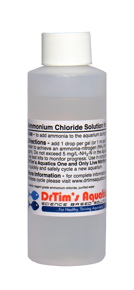 This bottle of reagent grade ammonium chloride is for use when fishless cycling. Concentration is 50 mg/L of total ammonia-nitrogen (TAN). Dose 4 drops per gallon of aquarium water.* Use with One and Only Nitrifying Bacteria.