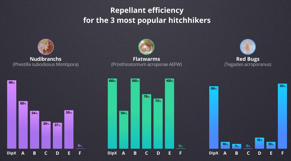 Corals that were bathed in DipX still repelled unwanted “hitchhikers”, even though they were previously dipped in other solutions On the other hand, corals that were dipped in other solutions after they were bathed in DipX did not repel anything.