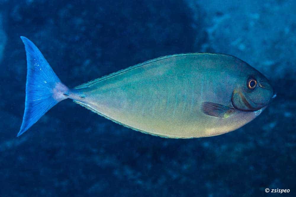 The Sleek Unicornfish has an oval shaped body that is laterally compressed. The mouth is forward on the body and the eye is set quite far back on the body thereby protecting the eyes while feeding. They are one of the few Unicornfish with no horns.