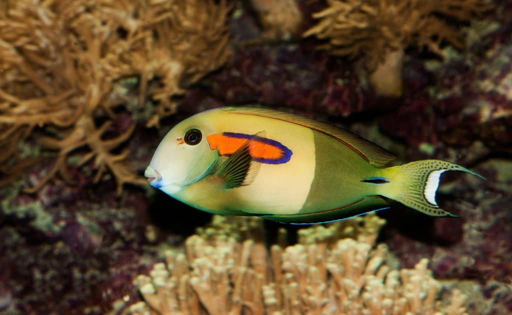 For this active and beautifully colored fish, a spacious 180-gallon or larger aquarium is essential to provide ample swimming room. The Orangeshoulder Tang is generally not aggressive towards other Tangs; however, if housing more than one in the same aquarium, it is best to introduce a juvenile alongside an adult.