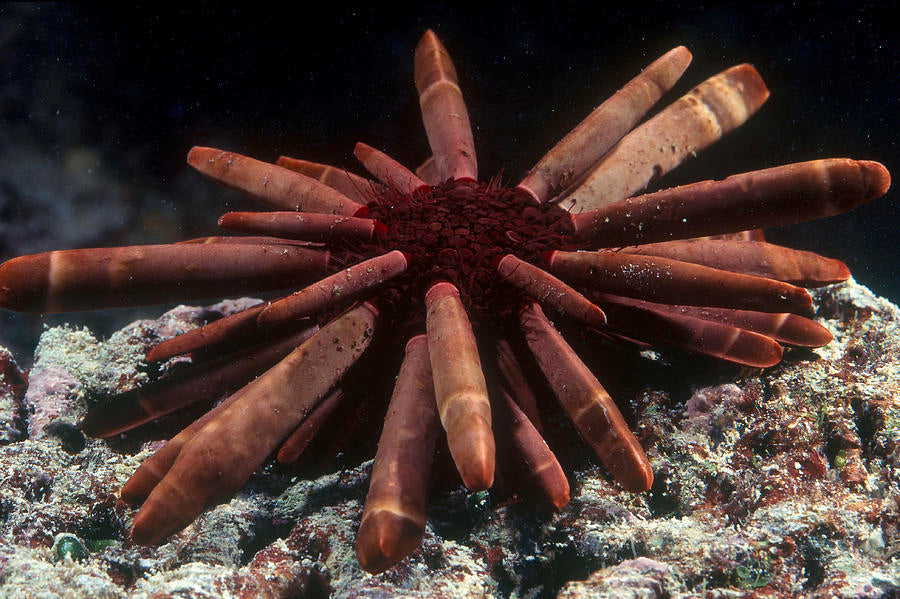 The Red Slate Pencil Urchin, also referred to simply as the Slate Pencil Urchin, sports an attractive reddish-tan body adorned with long, blunt, and solid spines that resemble pencils. These spines project outward in all directions, reaching lengths of up to five inches. Interestingly, this sea urchin earned its name not only due to its pencil-like spines but also because these spines were historically used as writing implements on slate boards.