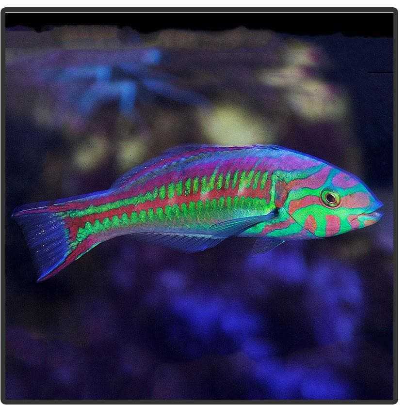 The Pinkface Wrasse, also known as the Five Stripe Wrasse, is a splendid addition to any aquarium, suitable for both novices and experts alike. Its vibrant colors and lively movements will undoubtedly enhance the visual appeal of the tank. This wrasse species can be easily recognized by its bright green and yellow body adorned with several thick pink stripes that run from its mouth to just behind the eyes.