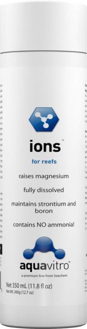 Using a fully dissolved magnesium is critical. Some magnesium supplements use a magnesium source that is simply not soluble, that is, unavailable. This means it can never be utilized by reef organisms, and is, consequently, of no value. If the product itself is milky white or the instructions direct the user to shake well, more than likely, a substantial amount of magnesium is not being utilized (the same is true of calcium products). ions™ also includes strontium and boron in the NSW ratio of 1.7:1 to avoid ionic imbalance with long term use.