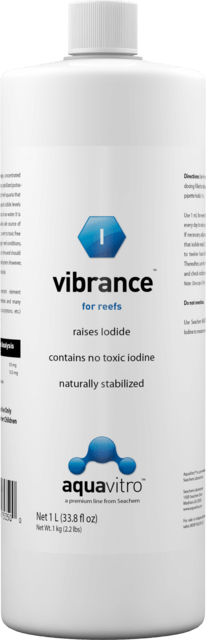 vibrance™ is a highly concentrated (10,000 mg/L) naturally stabilized potassium iodide source for reef aquaria that will restore and maintain iodide levels to those found in natural sea water. Our proprietary stabilization process makes vibrance™ the most stable iodide supplement available. It's also the most concentrated and comes with a pipette for precision dosing. It is formulated to provide a safe source of iodide that will not convert to toxic free iodine under storage or reef conditions.