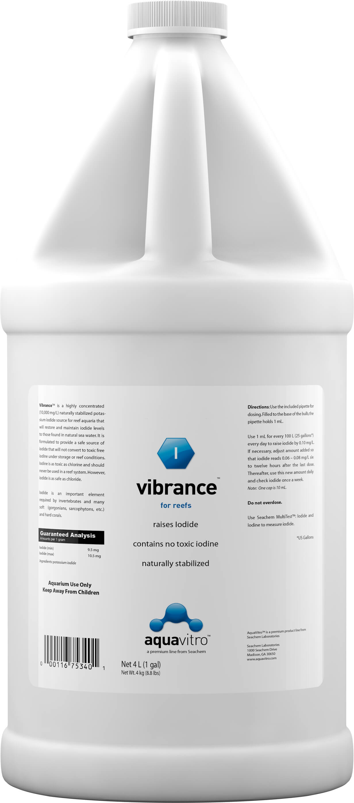 vibrance™ is a highly concentrated (10,000 mg/L) naturally stabilized potassium iodide source for reef aquaria that will restore and maintain iodide levels to those found in natural sea water. Our proprietary stabilization process makes vibrance™ the most stable iodide supplement available. It's also the most concentrated and comes with a pipette for precision dosing. It is formulated to provide a safe source of iodide that will not convert to toxic free iodine under storage or reef conditions.